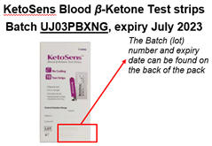 If you received KetoSens Test Strips batch UJ03PBXNG, please return any unused strips to wherever they were obtained from (may be a pharmacy) for a replacement.